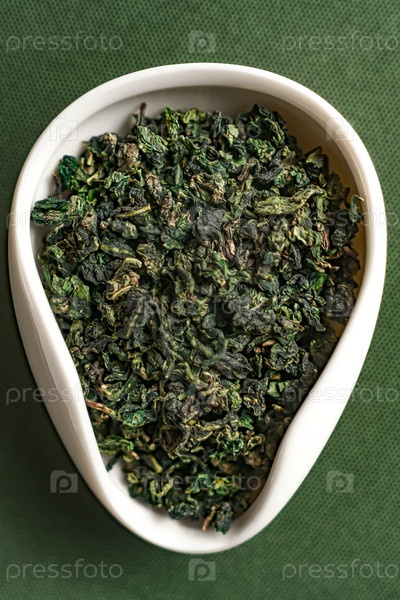 Сушеные листья зеленого чая красиво представлены в элегантной декоративной тарелке для удовольствия