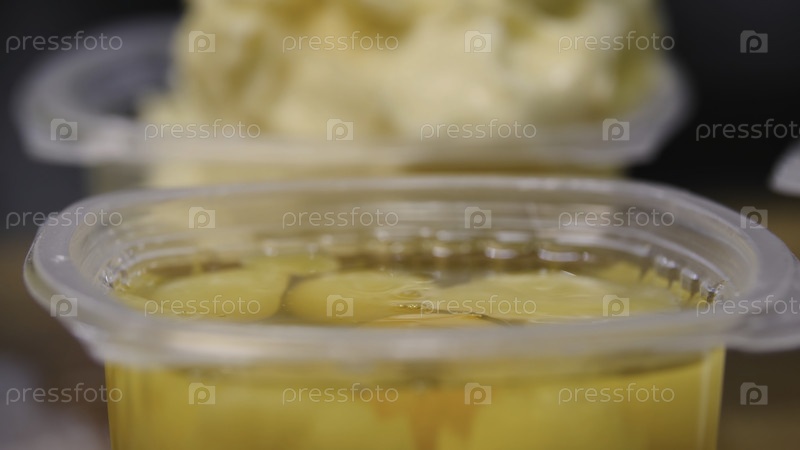 Закрытие ингредиентов в чашках для изготовления сладких пирожных. Резервное запись. Сырьесодержащие ингредиенты перед выпечкой стоят отдельно в пластиковых кружках. Яйца, мука, сахар и другие ингредиенты для выпечки
