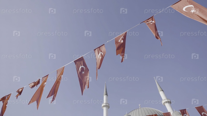 Стамбул, Турция-декабрь 2020: Турецкие флаги против голубого неба Продолжайте. Праздничная лента с турецкими флагами, размахивающими ветром. Турецкие флаги висят на праздничной веревке среди минаретов
