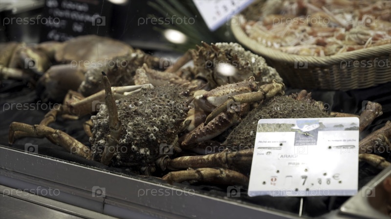 Свежие морепродукты в супермаркете.Продолжайте.Разнообразие в выборе морских продуктов, хранящихся в холодильнике в магазине