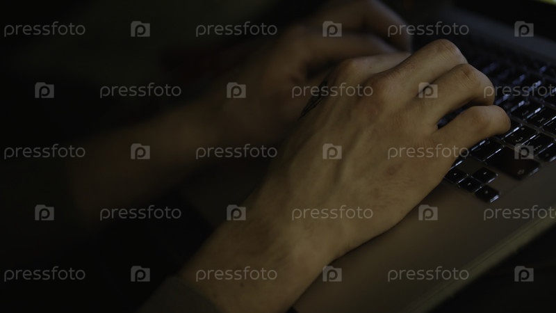 Закройте руки человека во время записи текста или кода на компьютере в естественном освещении поздно ночью