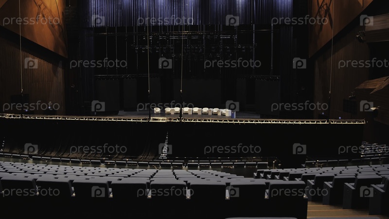 Конференц-зал перед образовательной конференцией СМИ Мужчина поднимается по лестнице среди пустых рядов стульев перед сценой с бежевыми стульями