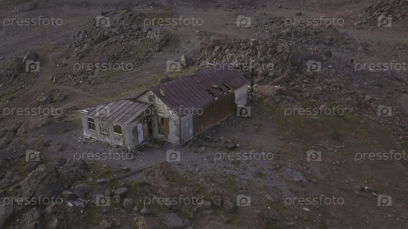 Вид с воздуха горной руины хижины с туристами в красивых швейцарских Альпах. Клип. Заброшенное старое убежище для путешественников в уединении высоких швейцарских Альп