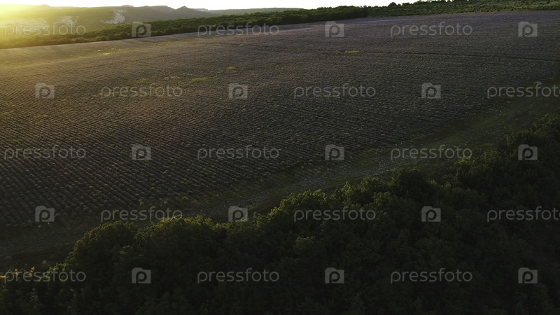 Вид с воздуха на большое поле лаванды, окруженное зелеными деревьями в восходящих лучах. ландшафт на плато Валенсол, Прованс, Франция, Европа