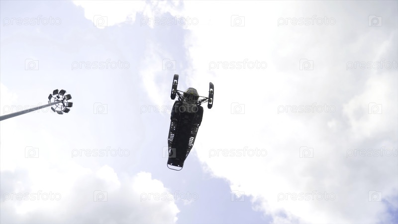 Екатеринбург, Россия-август 2019: Летающий снегоход. Идите вперед. Снегоход для демонстрационных выступлений на шоу фристайла с батутами. Нижний вид снегохода, летящего против неба