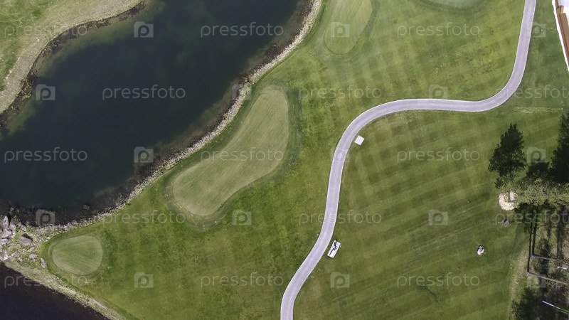 Поле для гольфа в солнечный день, отличный голф-клуб с прудами и зеленой травой, вид на небо