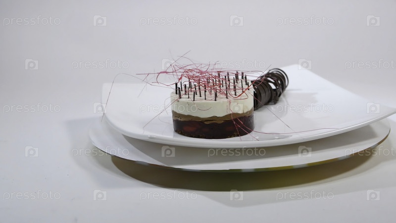 Кремовый торт с тремя слоями на тарелке, украшенный шоколадными крохи и шоколадной соломой