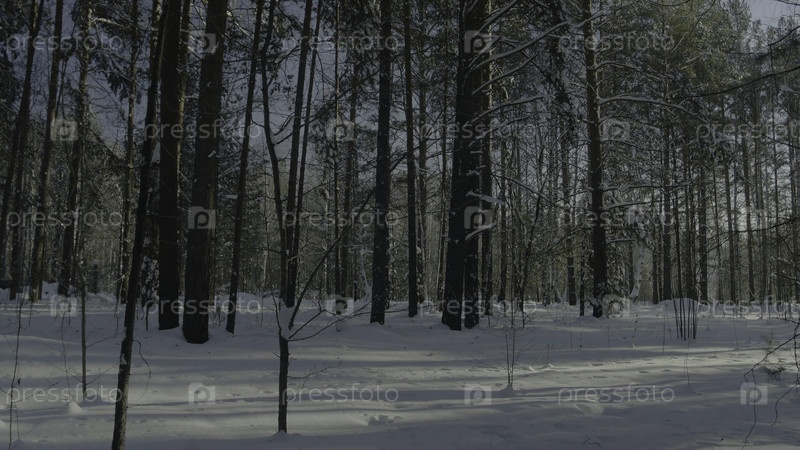 Яркий солнечный сосновый лес в снегу, прекрасный зимний пейзаж в лесу
