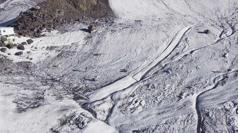 Вид на туристов, гуляющих по заснеженным горам. Клип. Альпинист ходит по снежным склонам огромной горы в солнечный день. Активный отдых в заснеженных горах