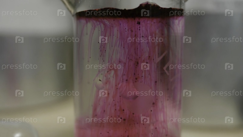 Красивая химическая реакция в колбе.Розовая или красная жидкость растворяется в колбе.Розовое вещество в колбе. Розовая или красная жидкость растворяется в колбе