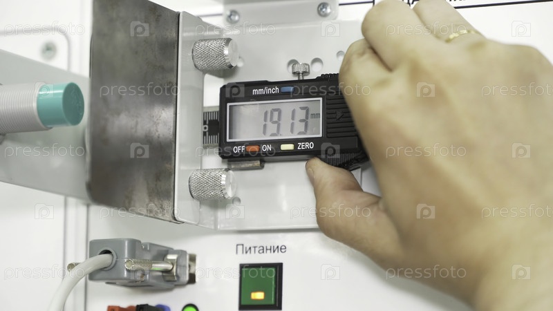 Промышленный фон с мужской рукой, держащей профессиональный инструментальный калибр, точность измерений