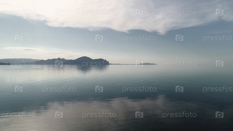 Зеркальная вода отражает голубое небо с горным горизонтом. Снимай. Живописный пейзаж с отражением синего неба на тихой поверхности моря. Соединяющееся море и небо разделены горным горизонтом
