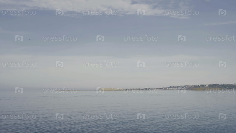 Прекрасный морской пейзаж с гладкой голубой водой в солнечный день. Идите дальше. На пляже спокойная голубая вода днем. Голубая вода против берега на горизонте