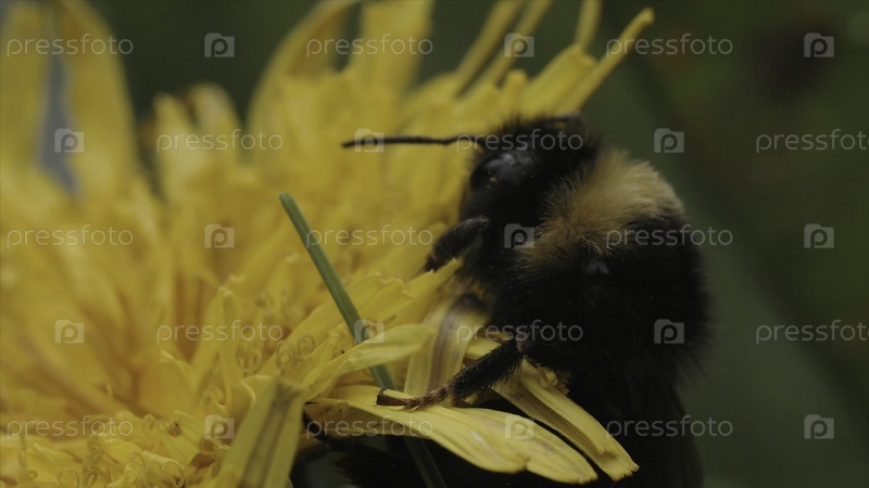 Закройте красивое насекомое, пытающееся подняться на цветочный бутон.Макро рамки с оской на желтом цвете собирают нектар на размытом зеленом фоне