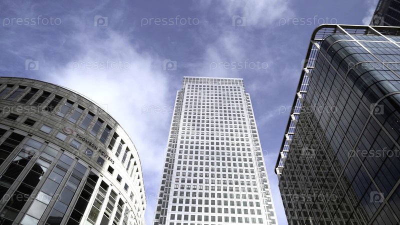Лондон, Великобритания - сентябрь 2019: Вид на деловой район с небоскребами на синем фоне. Идите вперед. Красивая современная архитектура офисных небоскребов с бизнес-центрами