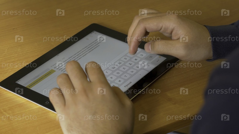 Близкий снимок мужских рук, использующих современный цифровой планшет и компьютер в офисе; фронтальный взгляд на руки бизнесмена, печатающего текстовую информацию на сенсорном экране планшета