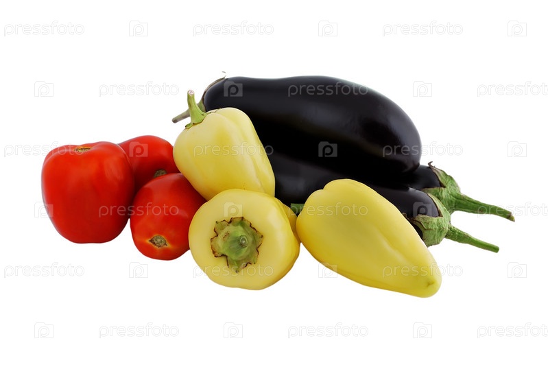 Овощи: помидоры, баклажаны и перцы на белом фоне