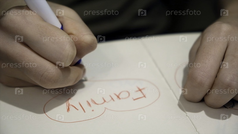 Детские заметки сердца в блокноте. Концепция. Идея детских слов, окруженных сердцем. Ребенок написал слово 'семья' и нарисовал сердце