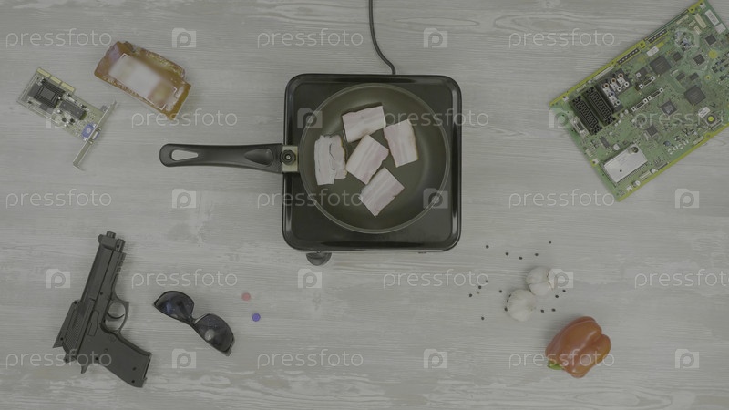 Человек готовит мясо в сковороде.Человек готовит ветчину на сковородке, на столе: пистолет, бокалы, чипсы и перец, абстракция для инстаграм-тарелки
