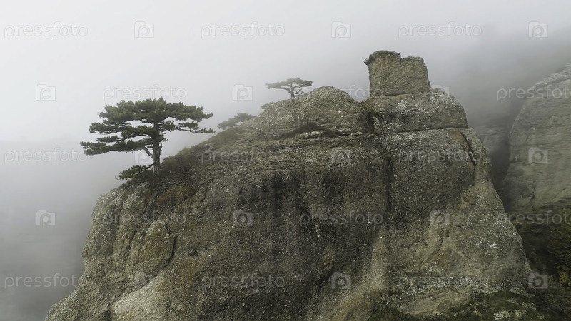 Зеленое дерево на краю скалы в тумане.Стреляй.Каменный столб на скале погружен в густой туман.Мистическая атмосфера осеннего тумана и одинокое дерево на краю