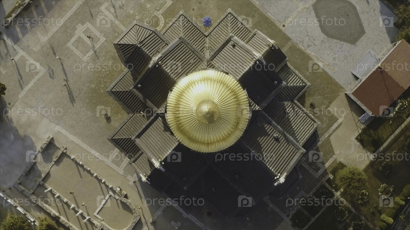 Вид на большую христианскую церковь с золотым куполом. Снимайте. Купол церкви в центре экрана