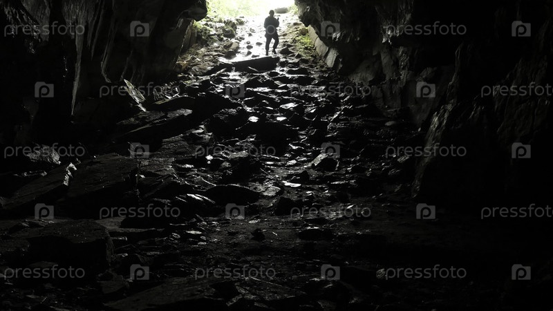 Путешественник спускается в пещеру. резервные кадры. путешественник исследует туннель пещеры, идущий по веревке. опасные пещерные тоннели, скользкие от влаги и внушающие страх перед неизвестной тьмой
