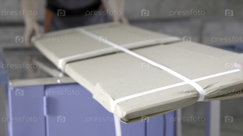 Рабочие упаковали плоскую сумку. Идите вперед. Работники в комбинезонах собирают строительный материал с завода для доставки на дом. Строительные материалы или мебель поставляются непосредственно из фабрики