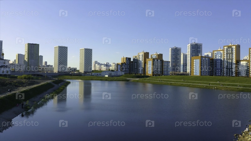 Екатеринбург, Россия, пруд с мостом в новом парке. видео. вид из воздуха красивого городского района с красочными многоэтажными зданиями на фоне синего неба