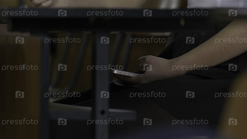 Женская рука использует смартфон под деревянным столом.Женщина пользуется интернетом на своем телефоне во время экзамена