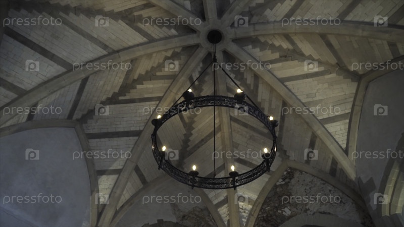 Вид снизу на старую люстру в форме колеса с лампочками, висящими с потолка в церкви или другом старом здании