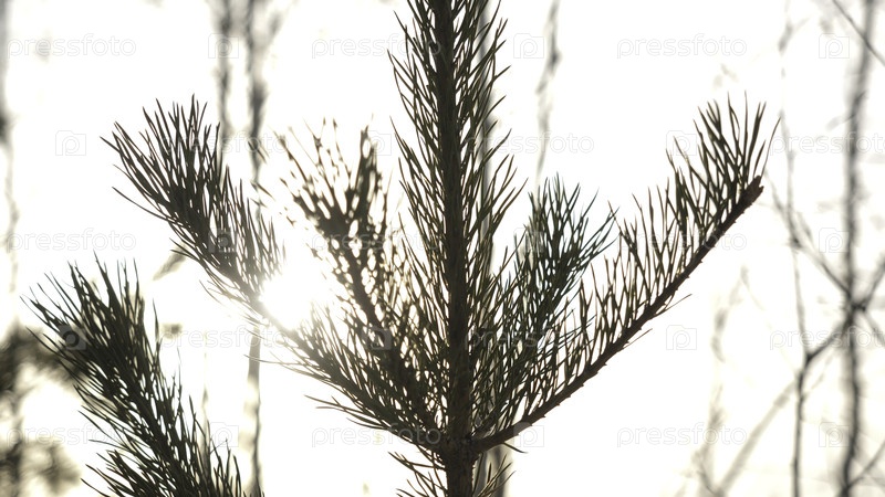 Рождественский пейзаж, зимняя красота. Яркие лучи заходящего солнца, солнечный свет. Природный декор xmas von Зимние ветви зеленых елей против леса при закате