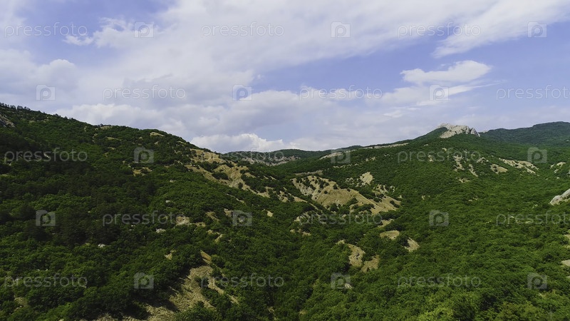 Вид сверху на крутые скалистые склоны на вершине зеленой горы против неба.Стреляйте.Прекрасный каменистый пик живописных зелёных гор