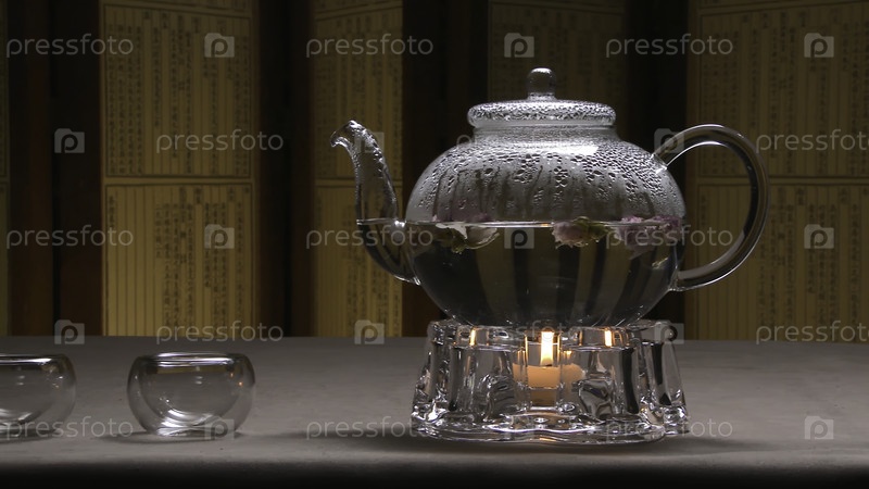 Красивая теплая картина прозрачного чайника с вкусным зеленым черным чаем на столе со свечами. Стеклянный чайник с цветущим цветочным чаем на деревянном столе. Стоять с маленькой свечкой. Китайский чай