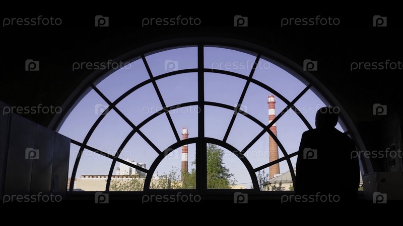 Сзади взгляд на старика, который приближается к круглому окну