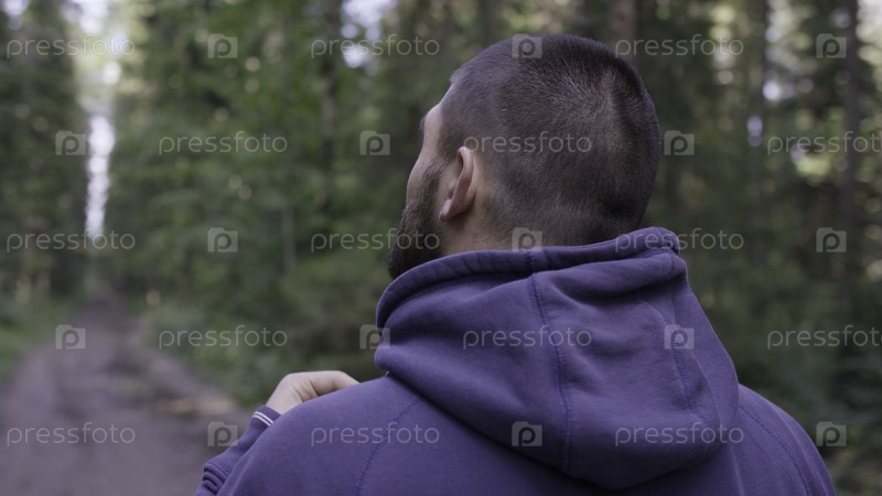 Спортсмен на дороге через лес.Разгляд сзади.Спортсмен на дороге в лесу.Спортсмен, стоящий на тропе по осеннему лесу