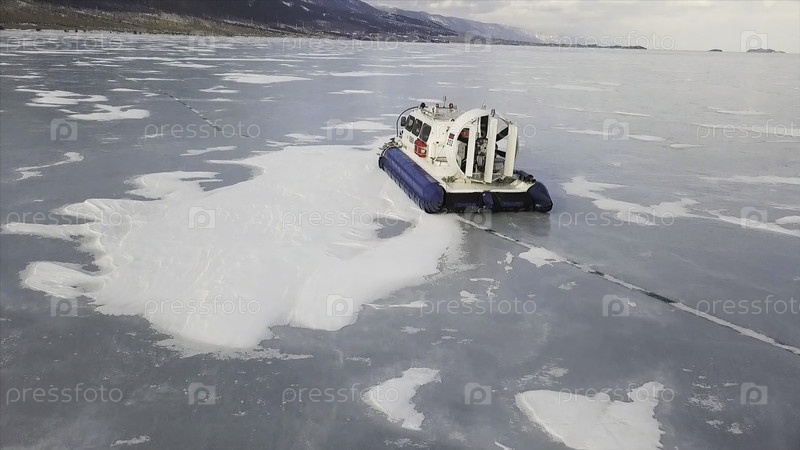 Вид с воздуха спасательного самолета, движущегося вдоль горного берега замерзшего озера во время зимнего сезона