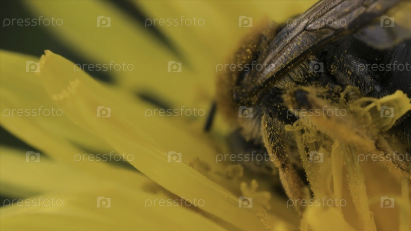 Осы на желтом одуванчике собирают пыльцу и нектар. Закрытие насекомых ос на жёлтом летнем цвете, концепция красивой природы