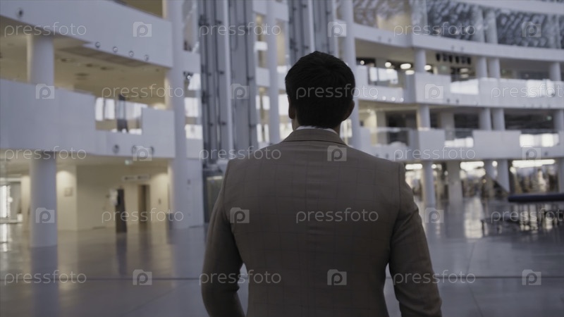 Бизнесмен в формальном костюме ходит по бизнес-центру.Мужчина в костюме идет по коридору офисного помещения - вид сзади.Молодой бизнесмен проходит через здание