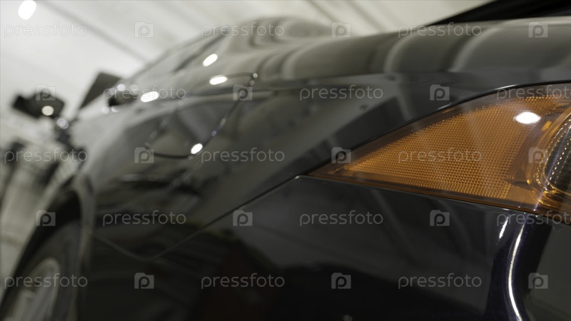 Сзади черный новый автомобиль в автосалоне, роскошная концепция.Искусство.Закрыть красные задние фонари и полированные крылья автомобиля, детали кузова