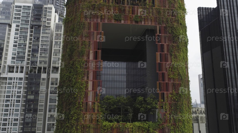 Высокая плотность зданий современного городского ландшафта и красные стены отеля с зеленым плюшем на них, Сингапур