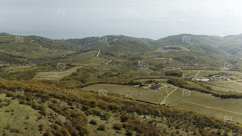 Вид с воздуха на зеленую сельскую местность под голубым небом. Снимайте. Идиллическая зелёная долина природных пейзажей. Драматический вид из воздуха на идиллические холмистые пластыри фермы с довольно лесистой границей
