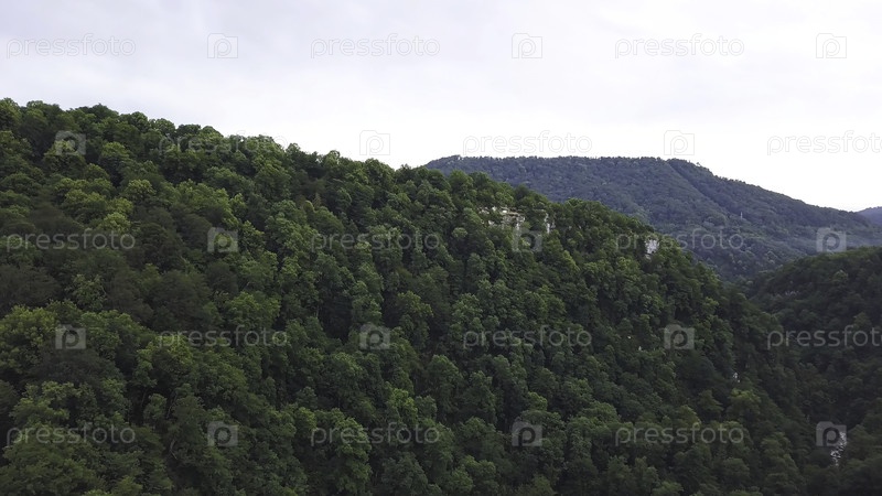 Природный пейзаж с красивыми лесистыми холмами, летними лиственничными лесами на фоне облачного неба