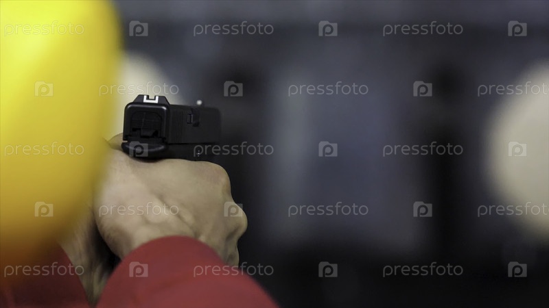 На заднем плане мужчина стреляет из пистолета на стрельбище вблизи.Человек стреляет из ружья на стрельбище в комнате.Закройте его.Закрывая руки мужчин оружием, человек тренируется стрелять сзади