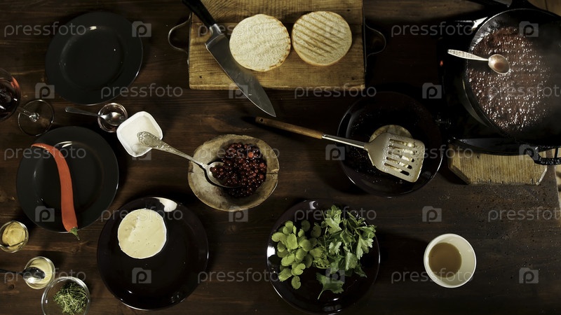 Вид на ингредиенты гамбургера на деревянном столе: сыр Камемберт, красный перец чили, петрушка, сельдерей и соусы