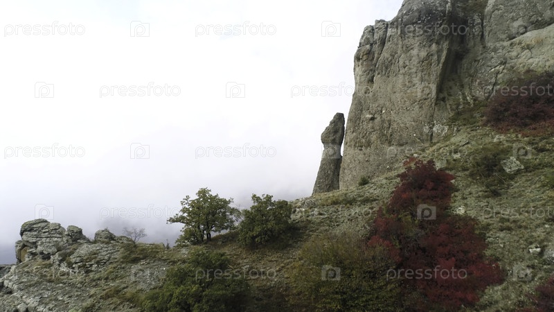Вид с воздуха на крутые скалы в густом тумане с красными красивыми кустарниками и желтыми кустами. вид сверху каменных холмов, покрытых туманными таинственными облаками и небольшими кустами, осенние пейзажи