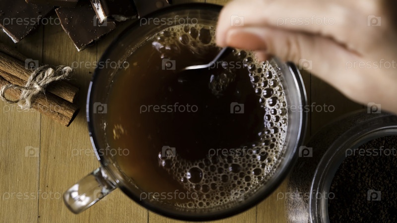 Концепция.Рука держит кофейную ложку и перемешивает горячий кофе на старинном деревянном фоне с корицей и шоколадом