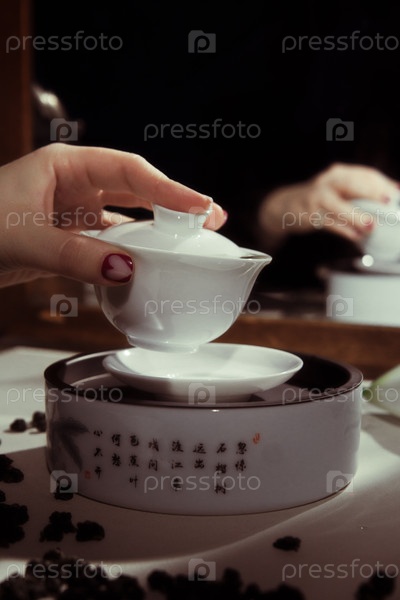 Спокойная чайная церемония, которая прекрасно изображает руку, наливающую чай из изысканно сделанных фарфоровых продуктов