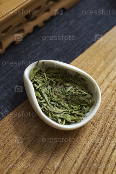 Нежные листья свежего зеленого чая расположены в очаровательных керамических блюдах на естественной деревянной поверхности