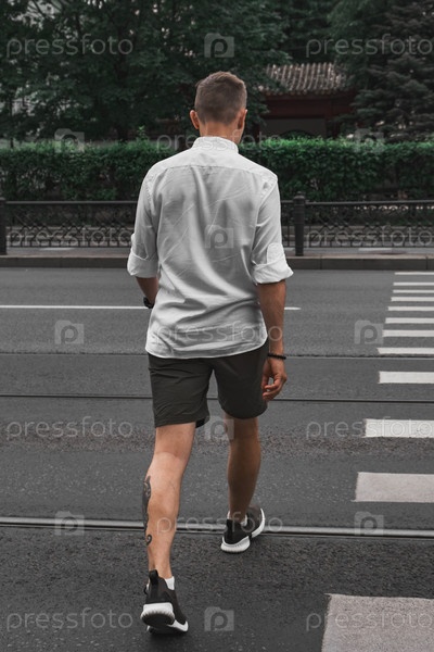 Мужчина пересекает улицу в повседневной одежде, воплощающей чувство стиля и свободы