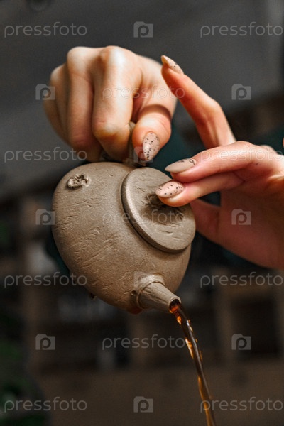 Красиво украшенный элегантный чайник грациозно наливает вкусный чай в чашку